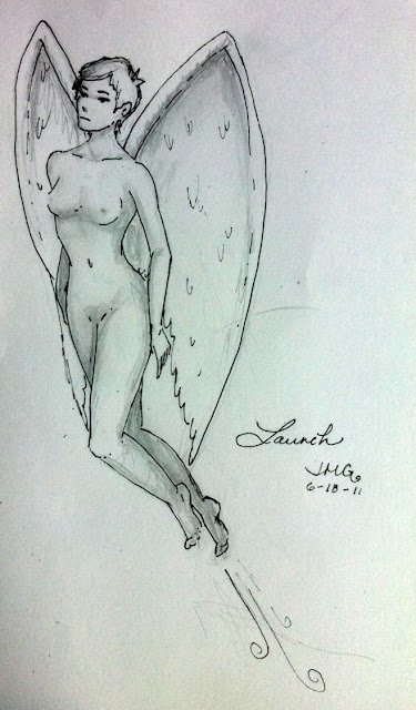 This week's theme for Illustration Friday is 'launch.' The first thing I thought of upon reading this was a watercolor and ink painting I did several years ago of several people in flight on great wings over the ocean. However, the painting is long sold (or given away, perhaps), and also, I don't believe in using old work for a challenge like this, feeling the whole point is to make something new, so I did a little sketch of just one person, on great wings.